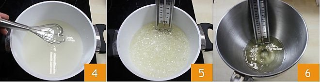 Keep the flame on low and stir the mixture with a small whisk, bringing it to a temperature of 237°F-239°F (4-5). To verify the temperature, a sugar thermometer is necessary. Once the sugar has reached this temperature, transfer it to a bowl 6,