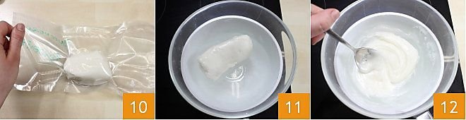 Once you have obtained the block, you can store it in the refrigerator, vacuum-sealed or in a food storage bag, removing as much air as possible 10. If you wish to use it immediately, skip this step and put the block in a double boiler 11 until it becomes liquid again, being careful not to exceed 140°F 12, otherwise, when glazing pastries, the fondant sugar will tend to crack and become dull.