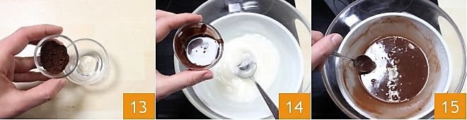 At this point, you can flavor the fondant sugar according to the preparation you want to achieve. If, for example, you want to prepare chocolate fondant sugar, dissolve the cocoa powder in a splash of water 13, add it to the fondant sugar 14, and mix well until you have a uniform color 15. We recommend doing this operation while keeping the fondant sugar in a double boiler at a temperature of 140°F.