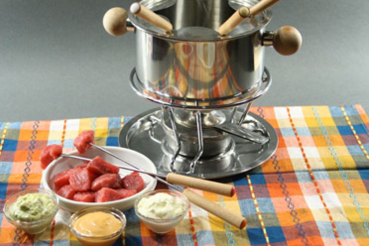 Place the burner in the center of the table so that diners can, using the special forks, skewer the meat cubes and immerse them in turn in the boiling oil.
