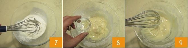 and work with the whisk to blend the powders into the mixture 7. Finally, add a pinch of water 8 and mix further 9. The batter should be quite thick.