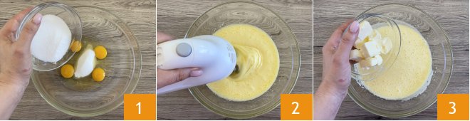 To prepare the cocoa four quarters cake, first weigh the shelled eggs and pour them into a bowl. Add the sugar 1 and whip with electric beaters 2 until the mixture increases in volume, becoming light and frothy. At this point, add the softened butter in pieces 3 and blend with the beaters to combine it. Also, add the vanilla extract and mix again.