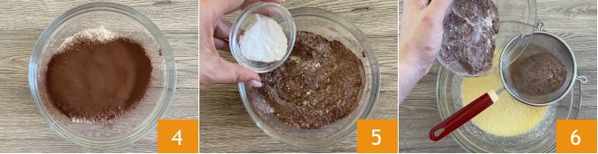 In a separate bowl, pour the flour, cocoa 4, and baking powder 5, then sift the dry ingredients into the egg mixture 6.