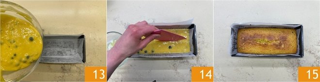 Transfer the batter to an 8.5x3.5 inches loaf pan, previously greased and lined with parchment paper 13. Using a greased scraper, gently make a line in the center of the loaf 14; this step is optional and only serves to achieve a more precise shape once baked. Bake in a preheated static oven at 365°F for 15 minutes, then lower the temperature to 330°F and bake for another 25 minutes. Always do the toothpick test before taking the loaf cake out of the oven 15.