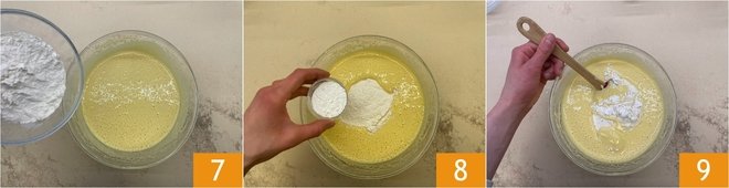 Add the previously sifted flour 7 and also the sifted baking powder 8. Stir with a spatula from the bottom up 9 to incorporate the powders without deflating the batter.
