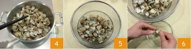 Once ready, remove the garlic cloves 4, drain them 5, making sure to save their cooking water, which will be used to cook the clams. Shell them 6, keeping some whole for garnishing the plates.