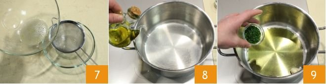 Filter the cooking water from the clams you collected 7 and use it to dilute the tomato paste. Now take care of cooking the fregola by placing olive oil in a hot pan 8, add 2 whole or crushed garlic cloves if you prefer, and a tablespoon of chopped parsley 9.