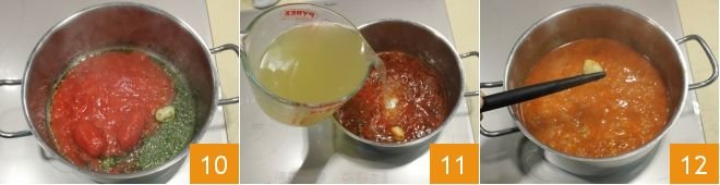 Then add the peeled tomatoes 10 and the tomato paste dissolved in the clam liquid, cook for a few minutes. Then pour a couple of ladles of vegetable broth 11; to make it best, follow the Vegetable broth recipe. Remove the garlic with kitchen tongs 12