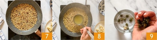 Toast it 7 and continue cooking as if it were a risotto, by pouring hot vegetable broth as needed until covered 8, allowing it to be absorbed before adding more. Check the fregola's cooking after 12 minutes. Soak the capers in lukewarm water 9 after rinsing them well under water to desalt them.