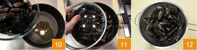In a large saucepan, heat the oil together with the peeled garlic and the sliced chili pepper. As soon as the base is hot, pour in the mussels 10, cover with the lid, and let the shells open for a few minutes, shaking the saucepan occasionally 11. Once they are all open, pour the mussels into a fine-mesh strainer to filter the juice from any shell or sand residues, and finally, shell them 12.
