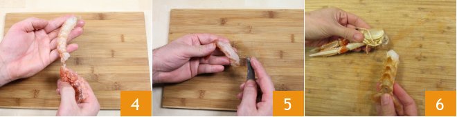 Then shell them by also removing the legs 4 and slice the back to remove the black thread, the intestine 5. Do the same with the scampi 6.