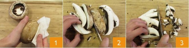 To make the fregola with portobello mushrooms, first prepare the Vegetable broth. Clean the mushrooms: cut off the base and use a cloth to remove any soil residue 1, then slice them 2 and chop into small pieces 3.