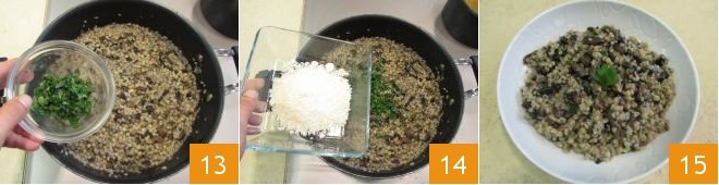 and finish with fresh chopped parsley 13 and grated cheese 14. Serve the fregola with portobello mushrooms hot 15.