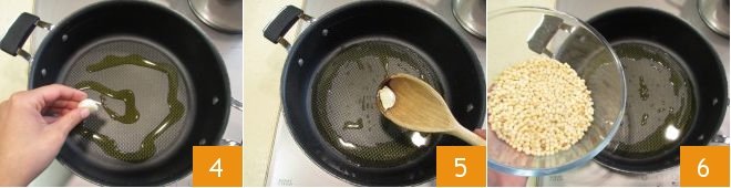 In a large pan, heat the oil, add the garlic clove, and let it brown over low heat for a few minutes to flavor the oil 4, then remove it 6 and add the fregola 6.