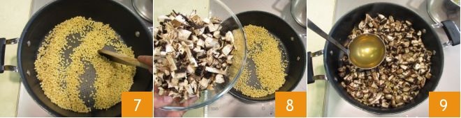 Toast the fregola for a few moments 7, then add the portobello mushrooms 8, stir, and continue cooking for about 20-25 minutes (follow the instructions on the package), adding the hot broth 9 one ladle at a time, as you do with risotto, waiting for the liquid to be absorbed before adding more.