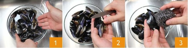 To prepare the fregola with pumpkin and mussels, start by cleaning the mussels. First, wash them under running water 1; then, using the back of a knife, remove the encrustations on the shell 2 and, with your hands, detach the byssus, the thread sticking out from the mussels. Then, using a scrubbing pad, clean the shell thoroughly 3, rinsing them under water as you go. Set the mussels aside for a moment and attend to the pumpkin.