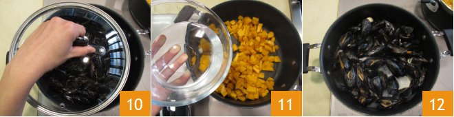 and cover with a lid and let the shells open 10. Once the pumpkin is well browned, pour in 100 ml of water 11 and cook it over medium heat for about ten minutes. Meanwhile, as soon as the mussels have opened 12,