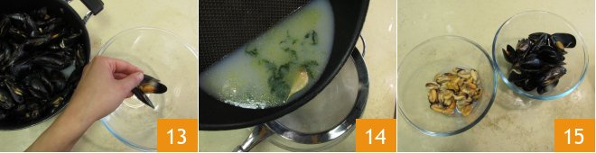 transfer them to a bowl 13, leaving the cooking liquid in the pan, which you should then filter 14 and keep warm. At this point, separate the mussels from the shells, being careful not to burn yourself, leaving some whole for the final decoration 15.