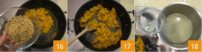 At this point, remove the garlic clove from the pumpkin, pour in the fregola 16 and let it toast 17. Pour the mussel cooking liquid into a saucepan and add 300 ml of water. Put everything on the stove to heat 18.