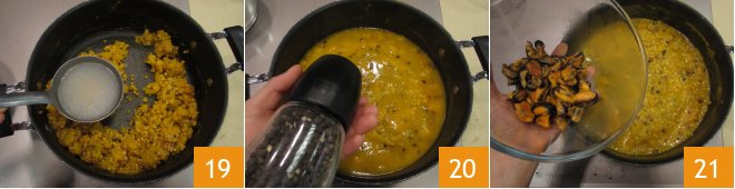 After a couple of minutes, add the first ladle of mussel broth 19 and continue cooking, adding more broth as needed and adjusting the amount based on the consistency of the preparation. Salt, pepper 20, and stir often. It will take about 20 minutes. When the fregola is cooked, add the mussels 21.