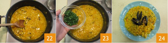 Stir 22 and flavor with chopped parsley 23. Serve the fregola with mussels and pumpkin, decorating with the whole mussels set aside 24!