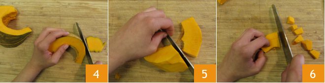 Remove the peel with a knife 4 and any seeds or internal filaments. Now cut it first into slices 5 and then into cubes 6.