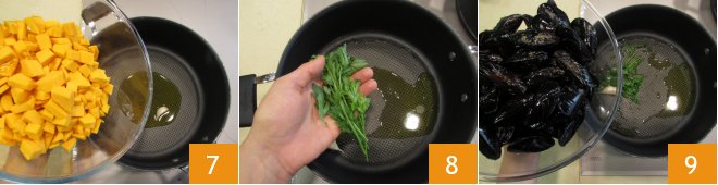 Sauté a clove of garlic with a splash of oil in a pan, add the pumpkin 7 and let it brown for a few minutes. Meanwhile, in another pan, put garlic, oil, and parsley 8, let it fry as well, then add the mussels 9.
