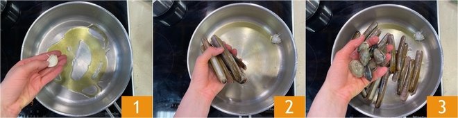 To prepare the fregola with seafood and samphire, heat a drizzle of extra virgin olive oil in a pan with a clove of garlic in its skin 1, then add the razor clams 2 and clams 3.