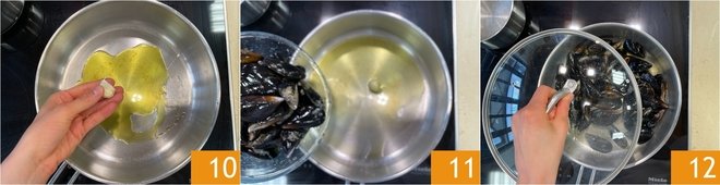 In a second pan, heat another drizzle of oil with the garlic in its skin 10, add the already cleaned mussels 11, cover with the lid 12 and let them open over high heat.
