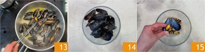 Once they are open 13, transfer them to a bowl 14 and shell them 15.