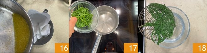 Again, strain the cooking liquid 16 and add it to the cooking water of the other seafood. Now move on to the preparation of the samphire emulsion: blanch 50 g of samphire for 30 seconds in boiling water 17, drain it and cool it immediately in ice water 18.