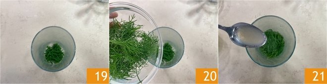 Pour the samphire into the mixer glass 19, the dill, the fennel 20, and a tablespoon of the shellfish water 21.
