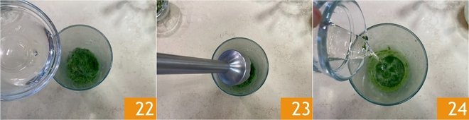 Add a splash of ice water 22, then blend 23. Gradually pour in the seed oil 24 while blending until you obtain a fluid and bright green sauce.