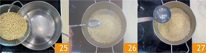 Now toast the fregola in a dry saucepan 25. When the grains are warm to the touch, begin cooking as if it were a risotto, pouring the filtered shellfish cooking liquid one ladle at a time 26 alternating with hot water to balance the saltiness 27.