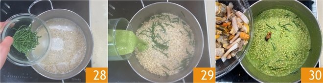After about 6–7 minutes, add the 100 g of coarsely chopped samphire 28 and cook the fregola, adding liquid as needed, for a total of 12–14 minutes (depending on size). When there's one minute left, incorporate 3–4 tablespoons of samphire emulsion 29 and stir vigorously until the fregola's cooking time is finished. At this point, turn off the heat and add three-quarters of the seafood 30.