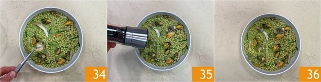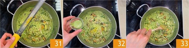 Flavor with grated lemon zest 31 and a tablespoon of samphire emulsion 32. Stir gently to combine 33.