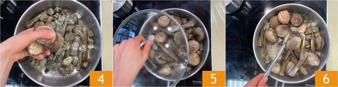 Also add the dog cockles 4. Cover with a lid 5 and wait for them to open over medium-low heat, stirring occasionally 6. Once they are all open, collect them in a bowl 6.