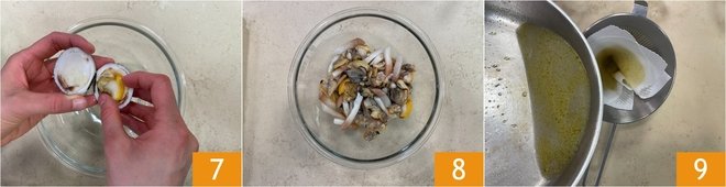 Shell the seafood 7 8 and strain the cooking liquid through a sieve lined with a kitchen cloth to remove any sand residues 9 and set it aside.