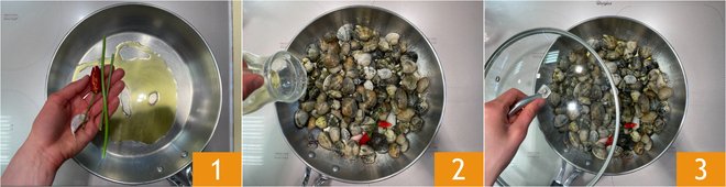 To prepare fregula with clams and bottarga, first pour a drizzle of oil into a pan, add garlic, parsley stems, and chili pepper 1, and sauté over high heat for a few minutes. Add the clams and deglaze with white wine 2. Cover with a lid 3 and wait for the clams to open.