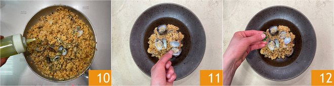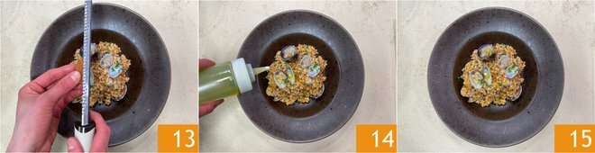 Grate some mullet bottarga on top 13, finish with a drizzle of oil 14. Fregula with clams and bottarga is ready to be served 15.