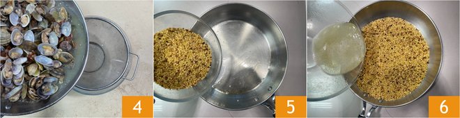 Strain the clam juice 4 and separate the clams from their shells, leaving a few whole clams for the final decoration. Transfer the fregula into the same pan where you cooked the clams 5 and toast over low heat for 2 minutes. Then moisten with the clam juice 6.