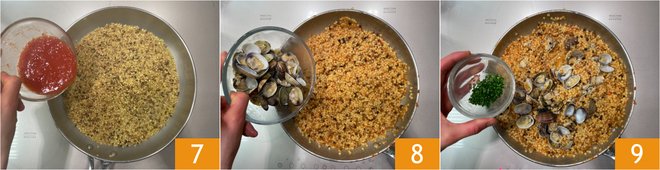 Add the tomato pulp 7 and continue cooking. The clam cooking water might not be enough, so add some hot water as needed, little by little. Adjust salt if necessary. Finally, add the clams 8 and chopped parsley 9.