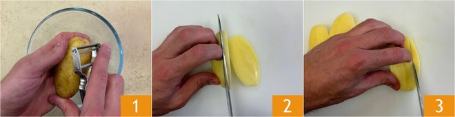 To prepare the French fries with pecorino fondue and bacon, first peel the potatoes 1 and cut them into slices about 0.4 inches thick 2, then into sticks about 2.4 inches long 3.