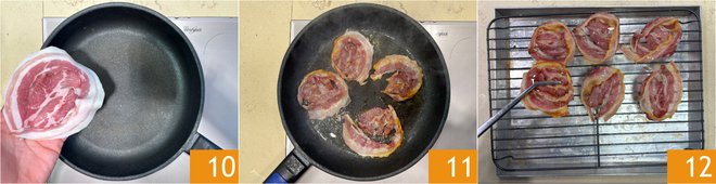 Set the fondue aside and move on to the bacon: place the slices in a hot non-stick pan 10 and brown them over medium-high heat for 3-4 minutes, turning them on both sides 11. Transfer the bacon to a rack and let it cool 12.
