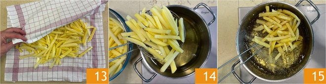 At this point, drain the French fries and dry them with a clean towel 13. Heat the seed oil in a saucepan to a temperature of 320°F-340°F, then immerse some of the fries 14 and fry until golden 15. Don't add too many at once, or the oil temperature will drop.