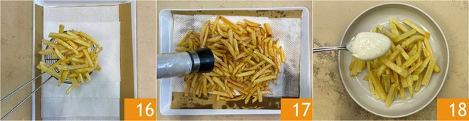 Transfer the fried fries to paper towels 16 and continue frying all the others, then salt them 17. Serve the French fries still hot, garnishing the dish with pecorino fondue 18.