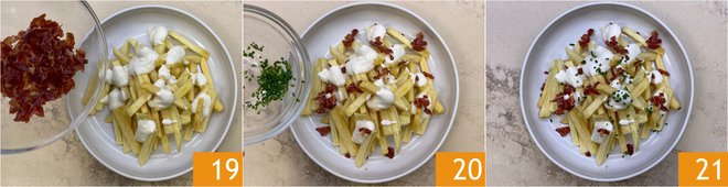 Finish with coarsely crumbled bacon 19 and chopped chives 20. Your French fries with pecorino fondue and bacon are ready to be enjoyed 21!