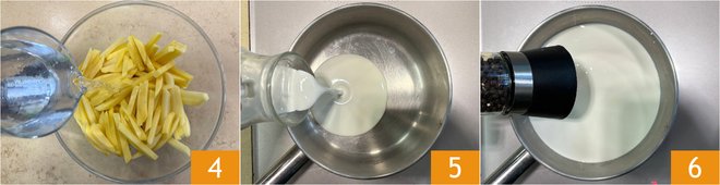 Transfer the potatoes to a bowl, cover with cold water 4, and let them soak for about 30 minutes. Meanwhile, pour the cream into a saucepan 5, add pepper 6, and heat over low heat to a temperature of about 140°F.