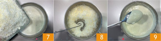 When the cream is hot, turn off the heat and add the grated pecorino 7, then stir with a whisk 8 until you get a thick and homogeneous cream 9. If it turns out lumpy, you can blend it with an immersion blender.