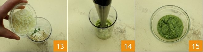 the grated salted ricotta and Tilsit 13, a pinch of salt, and blend everything with the immersion blender 14, then pour the obtained pesto into a small bowl 15.
